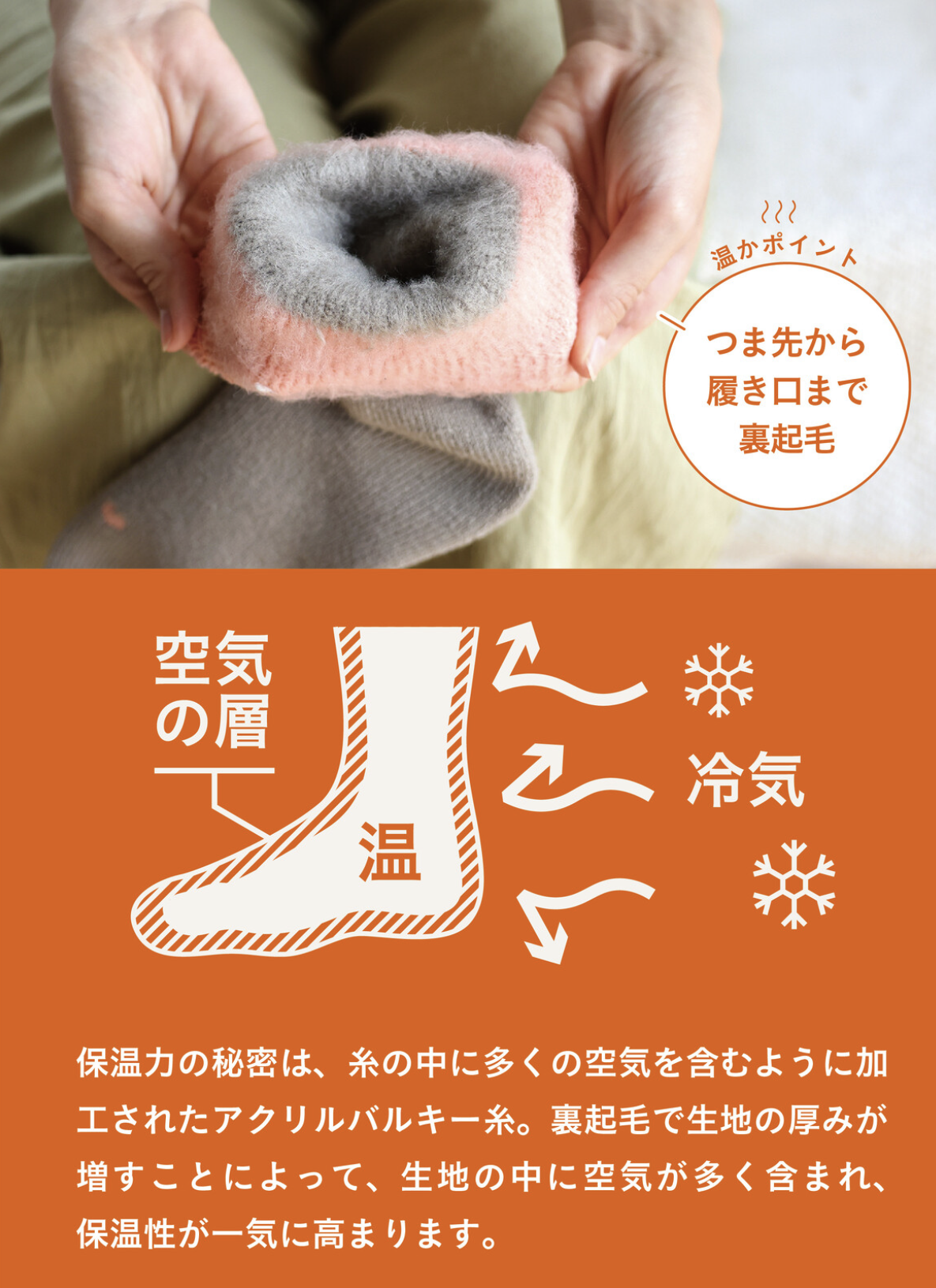 保温性をアップさせる加工を施した糸でふんわり編み上げた靴下は